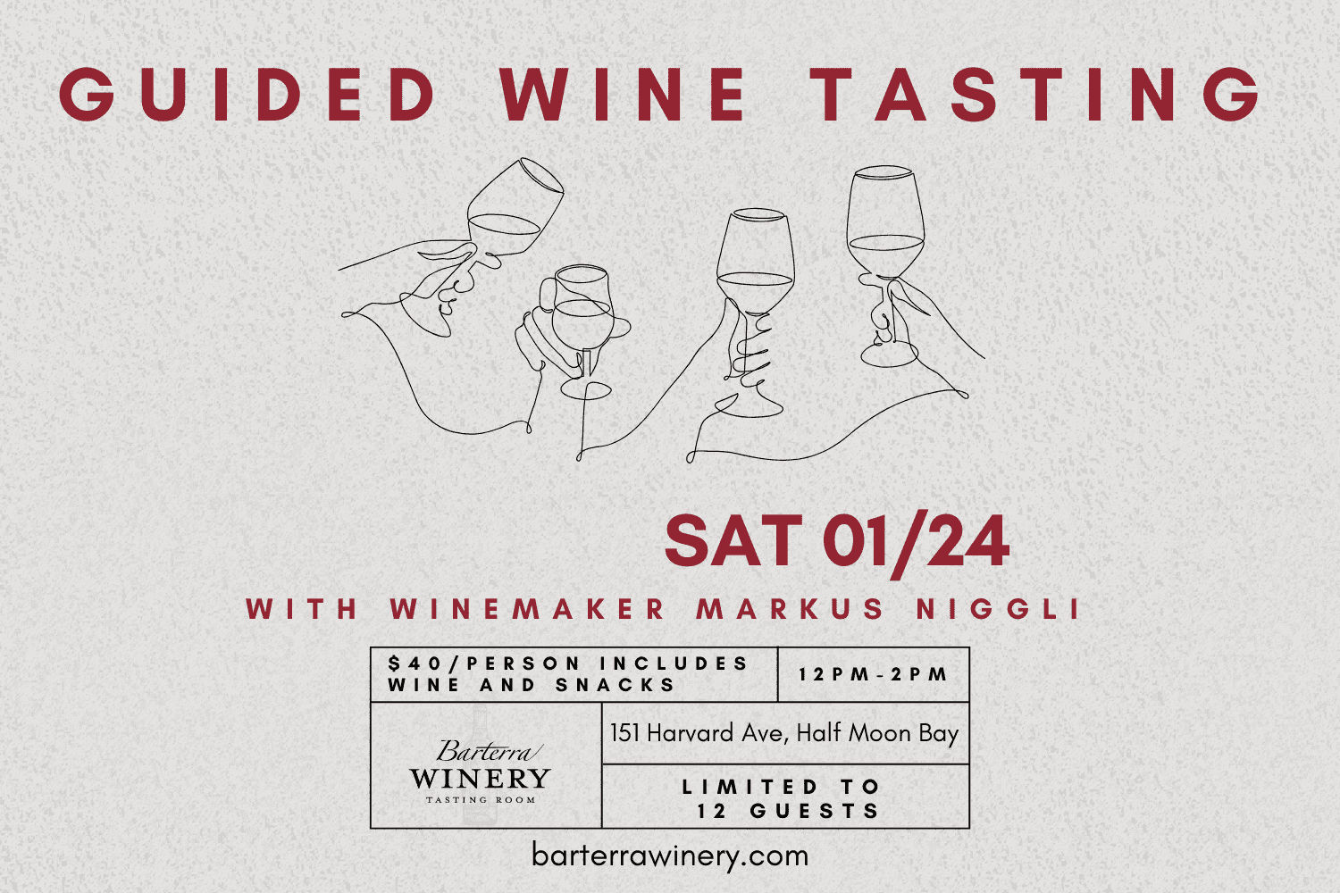 Barterra Winery 151 Harvard Ave, Half Moon BayJoin us for an unforgettable event at Barterra Winery as we welcome our winemaker Markus Niggli for an exclusive Guided Wine Tasting experience. Discover the stories behind the wines, learn about the winemaking process firsthand, and enjoy a curated selection of our finest vintages in an intimate and relaxed setting. This special tasting will feature […]