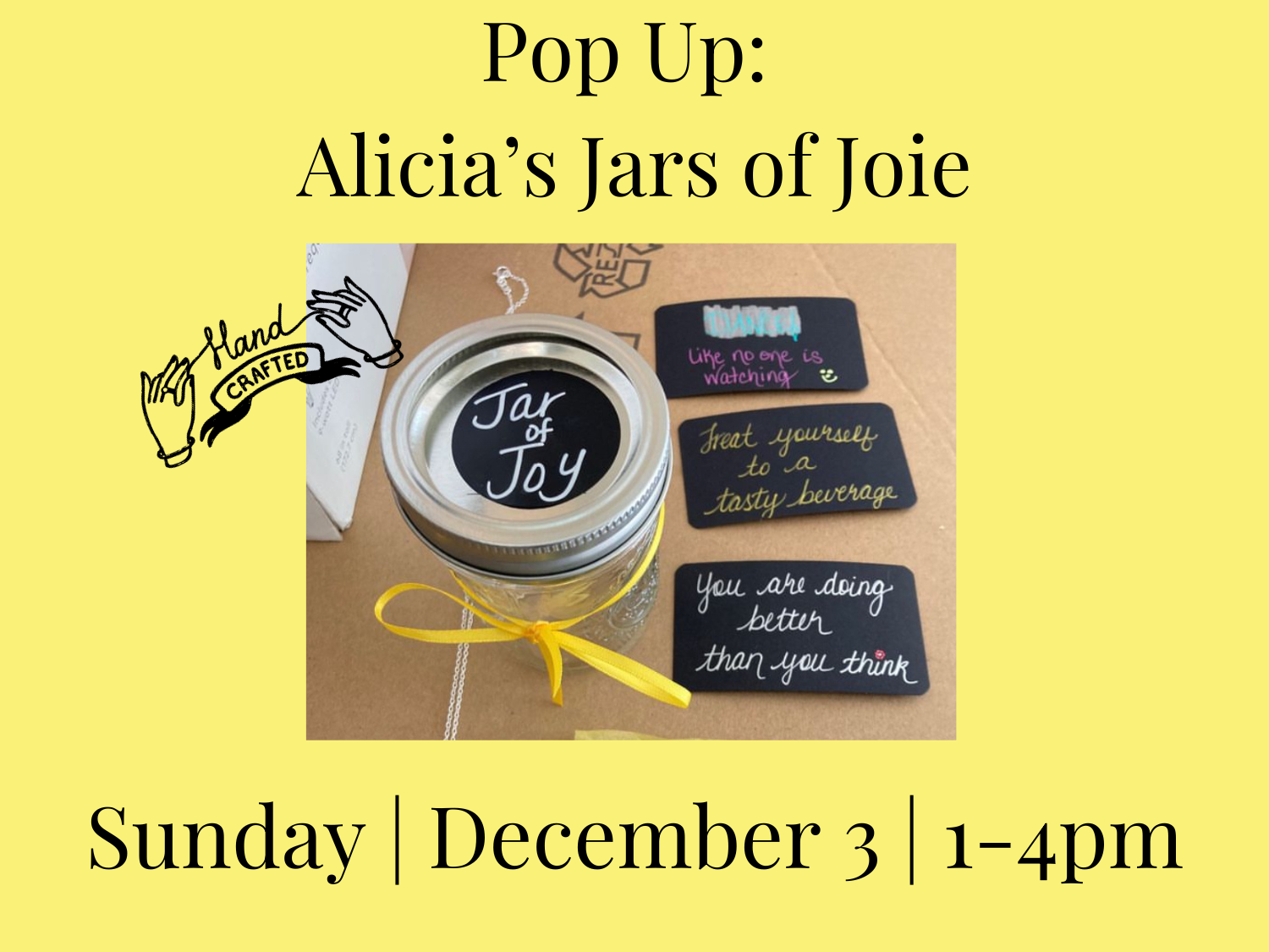 Started by Alicia during Covid-19 pandemic to bring joy and happiness to people when they’re feeling down, Jars of Joie allow you to be able to pull a positive affirmation card whenever you need. Great to make for yourself, or give as a gift to friends and family. The event is open to anyone who wants to help spread joy and positivity, either to themselves or others. Come anytime Sunday, December 3 from 1-4pm, and Alicia will be available to provide instructions to build your own Jar of Joie. She also has ready-made Jars of Joie as well as Jewelry available for purchase.