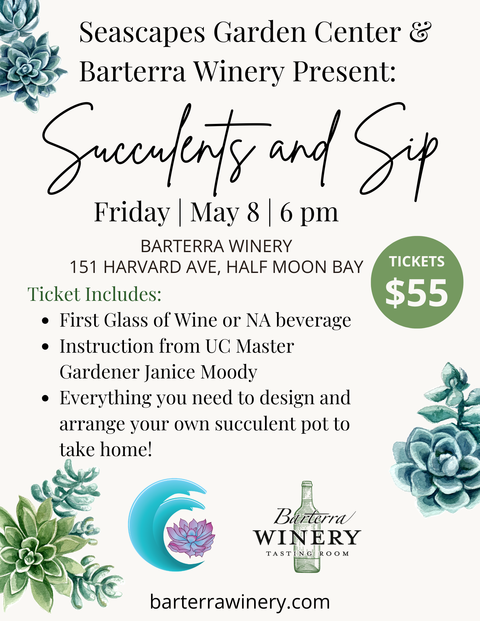 Join us on Friday, May 8 at 6 pm with UC Master Gardener Janice Moody from Seascapes Garden Center for a lesson on Succulent arranging while sipping on a glass of Barterra Winery’s Award-winning Wine!