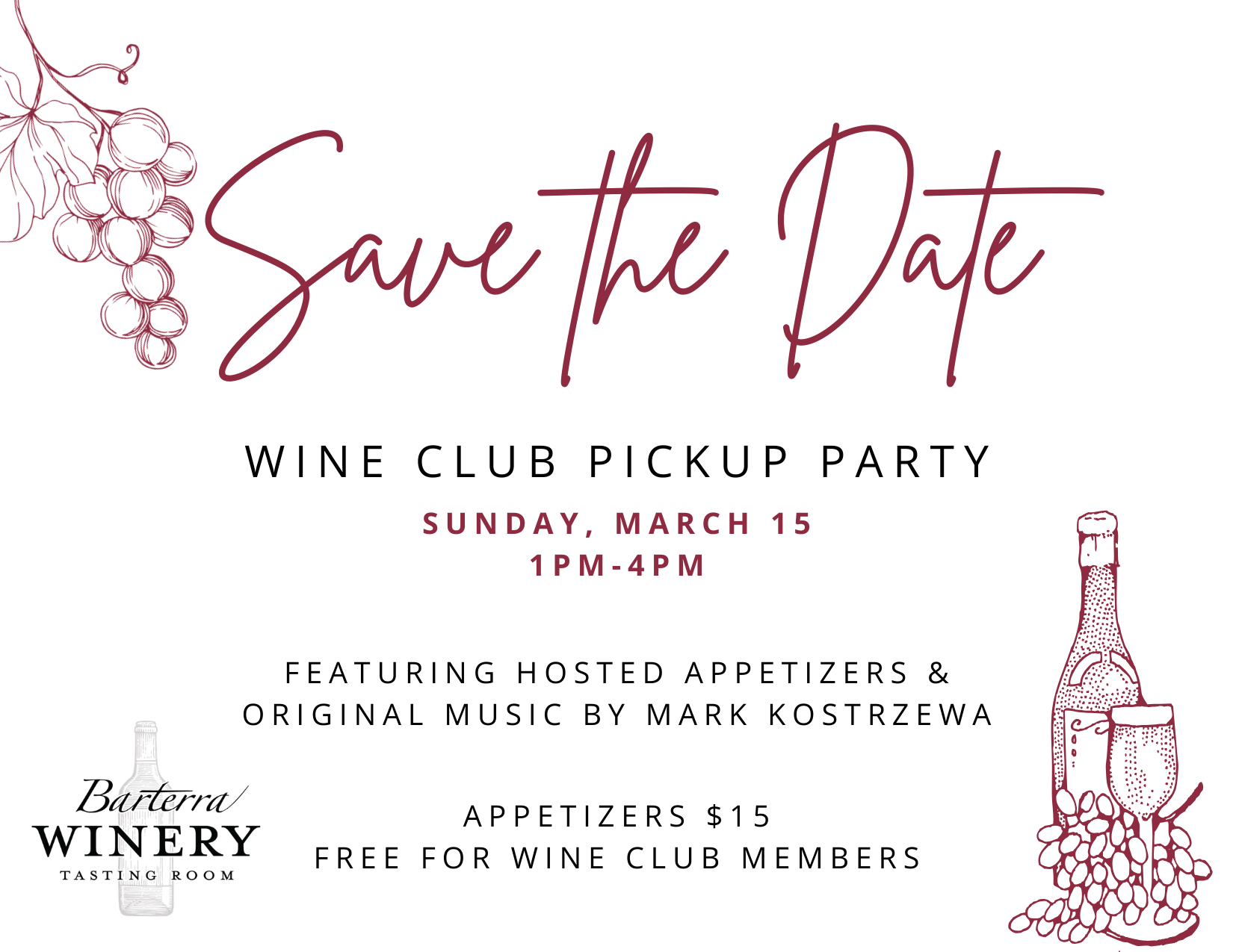 Join us on Sunday, March 15th, 1-4pm for our next Wine Club Pickup Party. Enjoy wine tasting, including new wine releases, a library wine, appetizers, and live music. Wine Club members get appetizers included with membership. Mark Kostrzewa will be playing acoustic guitar originals from 2 to 4 pm.