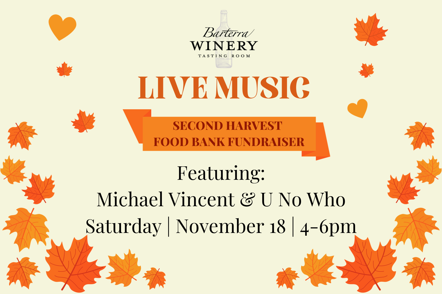 Join us Saturday, November 18 from 4-6pm for a Live Music Event Benefitting Second Harvest Food Bank!